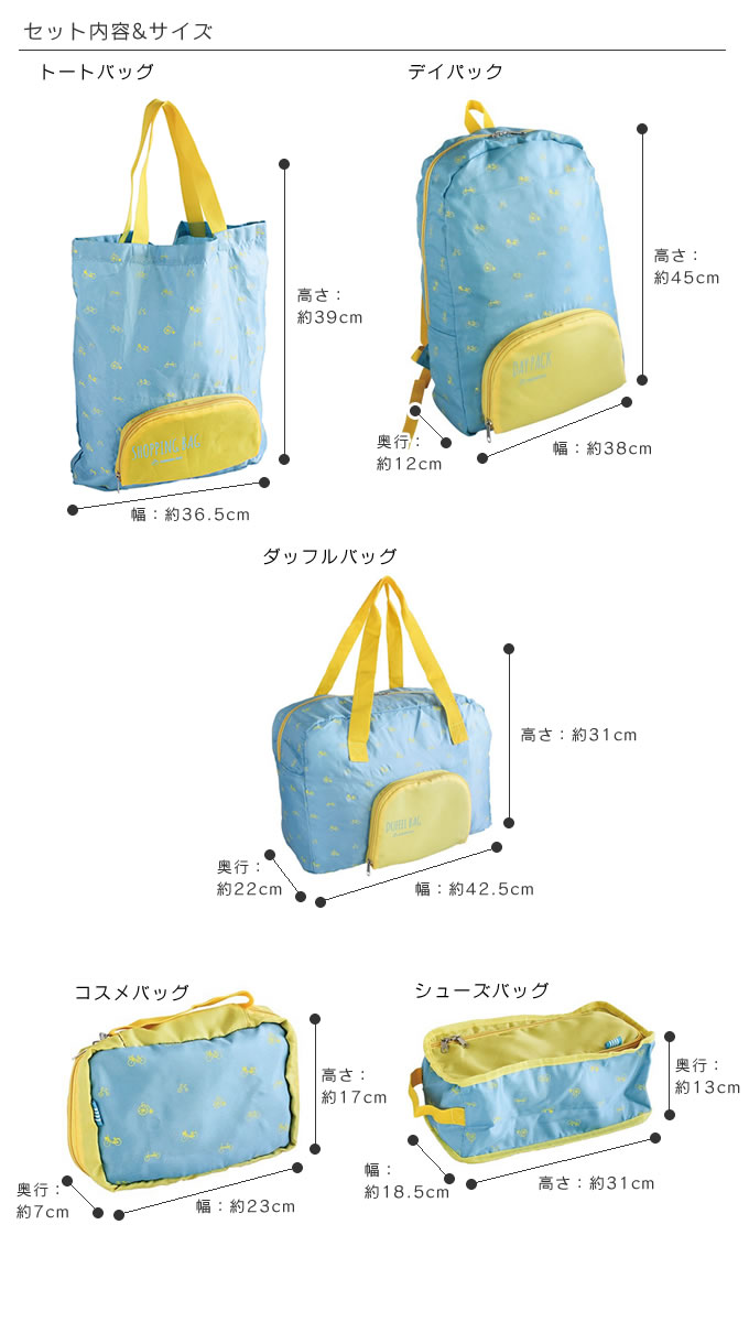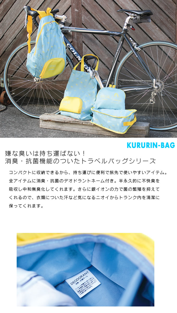 クルリントラベル バッグ ブルー 5点セット (トートバッグ&ボストンバッグ&デイパック&コスメポーチ&シューズケース) 軽量 男女兼用 旅行 コンパクト 消臭 抗菌 お泊り スーツケース用 / SPICE of Life