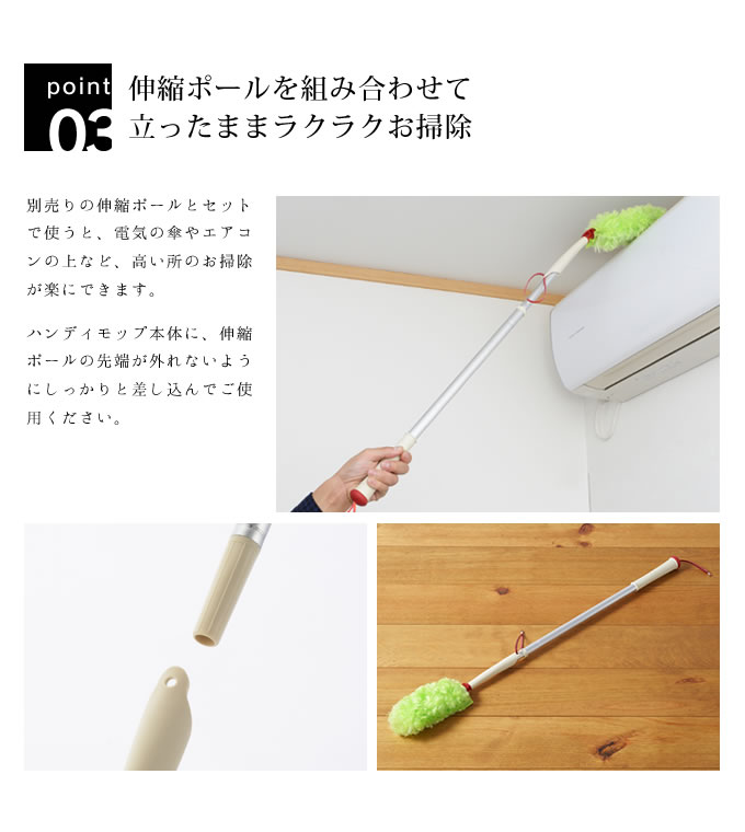 別売りの『伸縮ポール』とセットで使うと、電灯のカバーやエアコンなどの高い所のお掃除も楽々です。