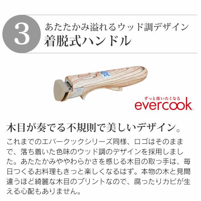 | ご注意事項 | evercookシリーズでは、一般的なフライパンの製法とは異なっているため、内面のフッ素塗膜がたわんだり、引き延ばされたりすることで、『しわ』『色差』ができます。