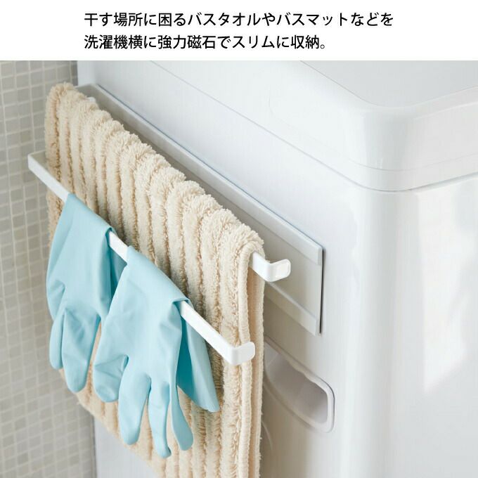 ポイント干す場所に困るバスタオルやバスマットなどを洗濯機横に強力磁石でスリムに収納。