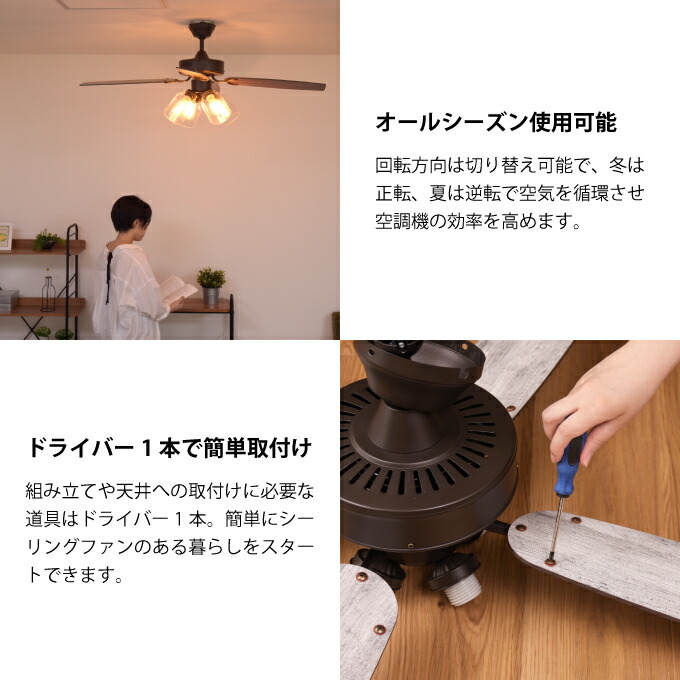 | セット内容 | 本体、羽根×4(リバーシブル)、羽根固定アーム×4、シェード×4、シェード固定リング×4(本体装着済)、取付金具(本体装着済)、リモコン、取付ネジ一式、取扱説明書(保証書付) ※リモコン用の単4電池×2本は付属しておりません。 |