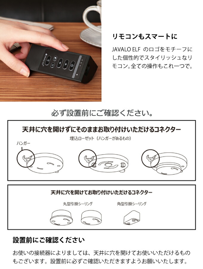 | ご注意 | 丸型、角型シーリングに取り付けの際は天井に木ネジを使用して固定する必要があります。 |