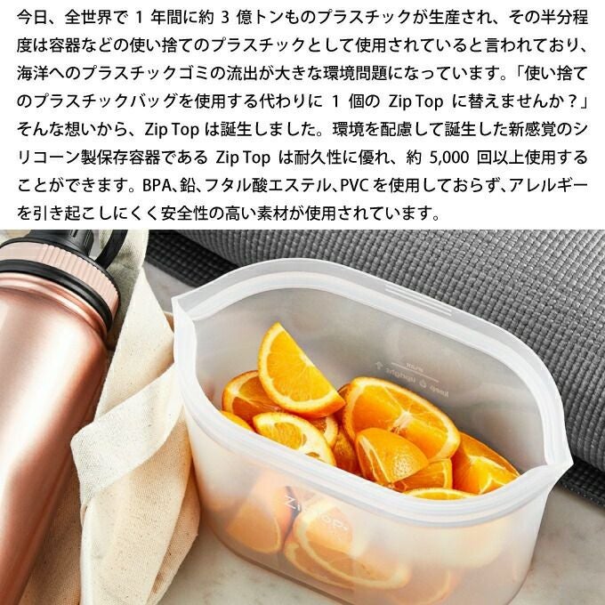 そんな想いから、Zip Topは誕生しました。環境を配慮して誕生した新感覚のシリコーン製保存容器であるZip Topは耐久性に優れ、約5,000回以上使用することができます。